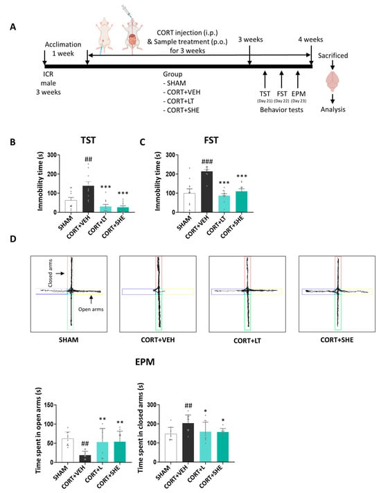 After a 1-week acclimatization period, the mice were divided into four groups (n = 10 per group): (1) SHAM group (injected with vehicle (VEH) + VEH, per oral (p.o.) administration), (2) CORT + VEH group (injected with CORT + VEH (p.o.)), (3) CORT + LT group (injected with CORT + L-theanine (LT) for positive control group at 50 mg/kg BW (p.o.)), and (4) CORT + SHE group (injected with CORT + SHE 500 mg/kg BW (p.o.)). Mice were subjected to repeated intraperitoneal (i.p.) injections of CORT (40 mg/kg BW) for 3 weeks. The dosages were selected based on the relevant literature [24,25,26,27,28]. In this study, LT was used as the positive control. After 3 weeks, behavioral tests were performed, and the mice were sacrificed for analysis. Brain tissues were isolated and stored at −80 °C. The experimental scheme is shown in Figure 2A.
