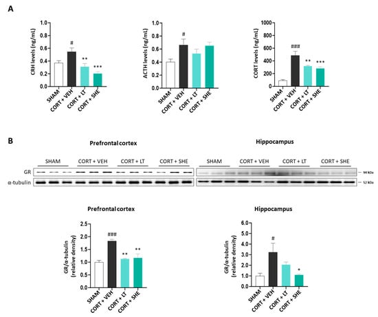 GR regulates HPA axis activity during stress response [32]. Therefore, we measured GR protein expression in the prefrontal cortex and hippocampus. GR expression was higher in the CORT + VEH group than in the SHAM group (prefrontal cortex: 1.8-fold, p < 0.001; hippocampus: 3.2-fold, p < 0.05); however, this increase was mitigated by SHE administration (prefrontal cortex: 1.6-fold, p < 0.01; hippocampus: 2.9-fold, p < 0.05). Our findings suggest that SHE improves the HPA axis dysfunction in mice induced by CORT injection (Figure 3B).
