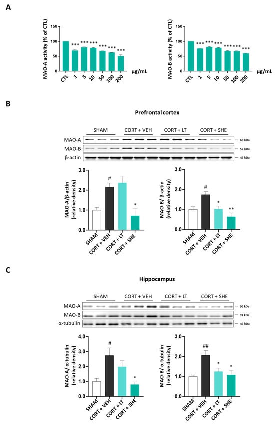 Furthermore, in the prefrontal cortex and hippocampus tissues of CORT-injected mice, MAO-A and MAO-B protein expressions were significantly higher in the CORT + VEH group than in the SHAM group. However, SHE administration reduced the expression of MAO-A and MAO-B. These results suggest that SHE prevents a decrease in neurotransmitter levels in CORT-injected mice by modulating MAO expression (Figure 4B,C).