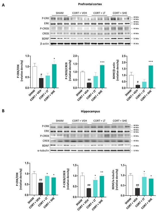 SHE upregulates extracellular-regulated kinase—cAMP response element binding—brain-derived neurotrophic factor signaling pathway in the prefrontal cortex (A) and hippocampus (B) of CORT-injected mice. # p < 0.05, ## p < 0.01 vs. SHAM group; * p < 0.05, ** p < 0.01, *** p < 0.001 vs. CORT + VEH group.