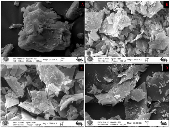 When it comes to scrutinizing the microscopic morphology and structure of solids, especially crystalline materials, scanning electron microscopy (SEM) serves as an indispensable tool [25]. A concentrated electron beam is used to scan a sample’s surface in order to create images of it. By interacting with the atoms in the sample, the electrons create signals that provide information about the sample’s surface topography and chemical composition. The morphologies of pure β-CD, ethyl acetate/β-CD, hexane/ β-CD and DCM/β-CD were characterized by SEM and the images are shown in Figure 1. The structural differences observed among the related complexes imply that additional crystalline phases may have emerged following complexation. In general, the β-CD particles (Figure 1) displayed irregular and parallelogram shapes under various inclusion complexes.
