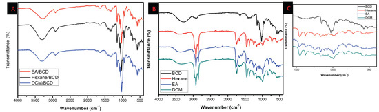 FT–IR spectra of Ethyl acetate/β–cyclodextrin, Hexane/β–cyclodextrin, DCM/β–cyclodextrin inclusion complex (A), FT–IR spectra of pure β–cyclodextrin and each extract without the presence of β–cyclodextrin (B), with enlarged form between 1550 cm−1 and 400 cm−1 (C).