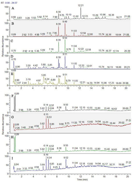 TIC of studied Inula sarana extracts in negative ion mode; (A) n-hexane extract; (B) ethyl acetate extract; (C) DCM extract; (D) ethanol extract; (E) 70% ethanol extract; (F) water extract; (G) n-hexane/β-CD; (H) ethyl acetate/β-CD; (I) DCM/β-CD.