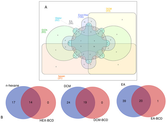 Venn diagrams showing number of compounds identified from the tested extracts (A). Comparison the identified compounds in the extracts and theirs complexes (B). EA: Ethyl acetate; DCM: Dichloromethane; EtOh: Ethanol; EtOh/Water: 70% Ethanol; BCD: β-cyclodextrin.