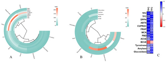 Circle heat maps for the results from antioxidant (A) and enzyme inhibitory assays (B) and Pearson correlation values between total bioactive compounds and biological activities (C) (TPC: Total phenolic content; TFC: Total flavonoid content; ABTS: 2,2′-azino-bis(3-ethylbenzothiazoline-6-sulphonic acid; DPPH: 1,1-diphenyl-2-picrylhydrazyl; CUPRAC: Cupric reducing antioxidant capacity; FRAP: Ferric reducing antioxidant power; AChE: acetylcholinesterase; BChE: butyrylcholinesterase; MCA: Metal chelating assay; PBD: Phosphomolybdenum).