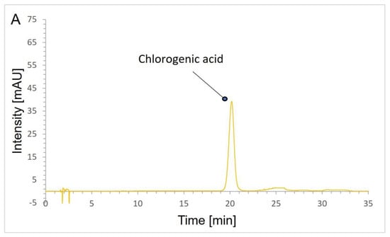 The chlorogenic acid content in the extract was calculated following the methodology indicated in the European Pharmacopeia (Ph. Eur. 10th Edition) and was 0.62 ± 0.004% (n = 3). The obtained value proves that the artichoke extract meets the pharmacopeial requirements in terms of the content of chlorogenic acid.