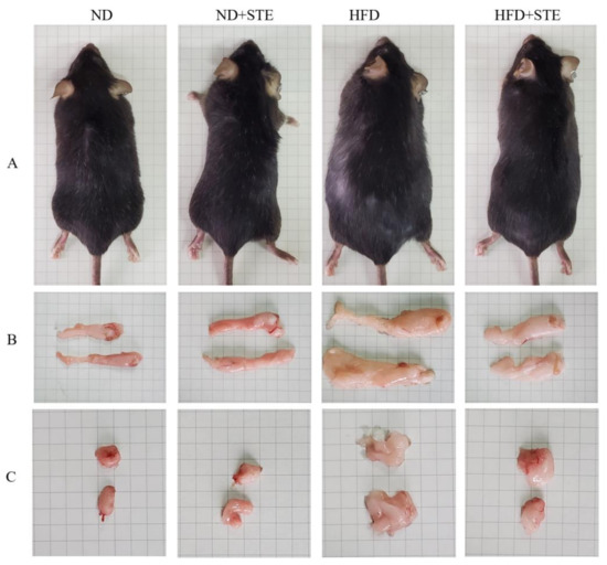 Effect of STE on body weight, perineal fat mass, and epididymal fat mass in high-fat diet-fed mice. (A) Mice; (B) epididymal fat; (C) perineal fat.