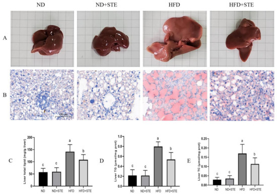 The STE lowered hepatic lipid accumulation in the liver of mice. (A) liver; (B) liver fat accumulation was assessed by oil red staining, bar = 100 µm; (C) liver total lipid content; (D) liver TG content; (E) liver TC content. Values are expressed as mean ± standard deviation. The same superscript (a, b, or c) in the same column represents no significant differences between values (p > 0.05).