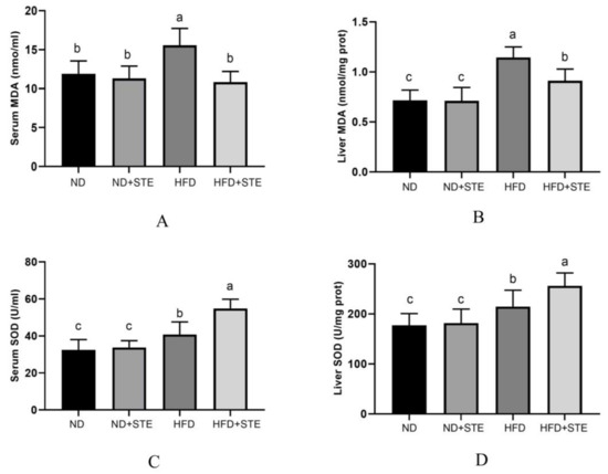 Oxidative stress is identified as one of the vital factors in the development of NAFLD and our previous study uncovered that cherry tomato lyophilized powder poses the influence of enhancing antioxidant activity and preventing lipid peroxidation in the liver [19]. The main character of SOD is to convert O2− into O2 and H2O2, stemming their accumulation in cells and preventing oxidative damage [36]. MDA is frequently used as an indicator to gauge the level of oxidative stress [37]. Increased-scale concentrations of MDA can result in oxidative damage to cell membranes, proteins, nucleic acids, and other biomolecules by binding with them, with the level of MDA in the liver reflecting the degree of lipid peroxidation in hepatocytes. As unmasked in Figure 5A,B, the liver and blood of HFD mice exhibited more MDA contents in comparison to ND and HFD + STE mice. Notably, the administration of STE ameliorated the oxidative stress. In response to oxidative stress, the body augments its antioxidant capacity by upregulating the activity of antioxidant enzymes (e.g., SOD) to protect the body from oxidative damage [38], which was confirmed by our experimental results. As revealed in Figure 5C,D, SOD activity in the liver and blood of HFD mice was significantly higher in contrast to ND mice (p < 0.05) but reduced in contrast to HFD + STE mice, making it clear that mice can improve the activity of antioxidant enzymes in the body to resist oxidative damage from the high-fat diet but the protective mechanisms may fall short in their ability to adequately counter the external damage inflicted; the STE can further reduce the oxidative stress by upregulating the antioxidant enzyme activity.