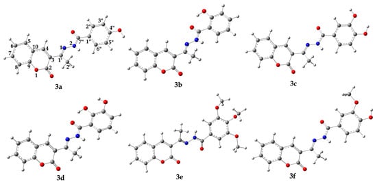 The signals in the 1H NMR spectra of derivatives 3 were assigned to three groups of protons. Singlets originating from the protons of the methyl group were observed at approximately 2.30 ppm in the 1H NMR spectra of all the compounds. The aromatic protons of coumarin and hydrazide moiety were in a region of 6.64–8.01 ppm. The hydrogen atoms of NH and phenolic OH groups were observed in the regions of 10.53–11.79 ppm and 9.29–11.41 ppm as broad singlets. In the spectra of compounds 3e and 3f, singlets originating from protons of methoxy groups attached to the aromatic ring at about 3.85 ppm were observed. In the 13C NMR spectra of all the products, the carbon atom of the methyl group appears around 17 ppm. Signals in the range of 105–145 ppm were attributed to aromatic carbon atoms. Peaks detected at around 150, 153, and 160 ppm originate from C–O, C–N, and C=O carbon atoms. The additional peaks at about 60 ppm were observed in the spectra of compounds 3e and 3f because of the presence of methoxy groups.
