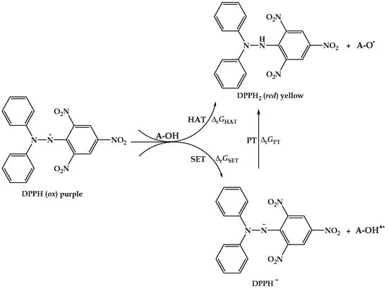 Potential free radical scavenging mechanisms are discussed based on the reaction free energies (ΔrG) following the HAT and SET-PT mechanisms (Figure 3). Calculations were performed using methanol as the solvent, mimicking the in vitro DPPH test conditions. The difference in energies between the reactants and products serves as the primary criterion for determining the probability of the occurrence of the reaction. The lower value of thermodynamic parameters describing HAT and SET mechanisms indicates the favorability of the pathway by which reaction occurs. The optimized geometries of the reactants involved in the reaction, namely DPPH•, DPPH2, and DPPH− are presented in Figure S5.