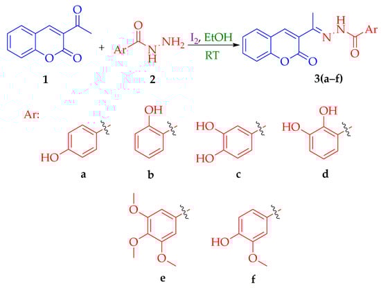Synthesis of coumarin N-acylhydrazone derivatives: 3-acetylcoumarin (1), benzoyl hydrazide (2), iodine as catalyst (10 mol%), absolute ethanol, and room temperature (RT).