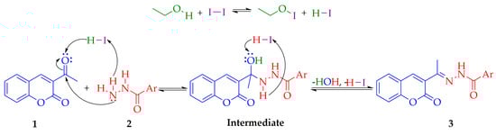 The suggested mechanism for the synthesis of coumarin N-acylhydrazone derivatives 3 was presented in Scheme 2. In this reaction, molecular iodine most likely acts only as a precatalytic. In the first step, as a solvent, ethanol reacts with molecular iodine to give the Brønsted acid HI, which further acts as a catalyst, as shown in Scheme 2. In the subsequent step, the carbonyl group of 3-acetylcoumarin is protonated with Brønsted acid HI, followed by the nucleophilic attack of hydrazide’s nitrogen atom to the carbonyl group, and the deprotonation of the same nitrogen atom. In this manner, an appropriate hemiaminal is formed as an intermediate. The resulting intermediate undergoes dehydration in a similar way. During this stage, the HI species facilitates the protonation of the hydroxyl group, leading to the formation of a water molecule, with simultaneous deprotonation of the nitrogen atom. In this way, corresponding coumarin N-acylhydrazone derivative 3 is formed.