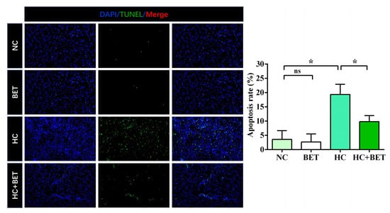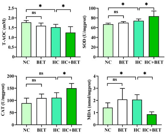 Data analysis was performed using SPSS 22.0 software (SPSS Inc., Chicago, IL, USA). All data were expressed as mean ± standard error of the mean (SEM). One-way ANOVA analysis was performed, followed by Duncan’s multiple comparisons between groups (NC vs. BET, NC vs. HC, HC vs. HC + BET). A value of p < 0.05 indicates a statistically significant difference.