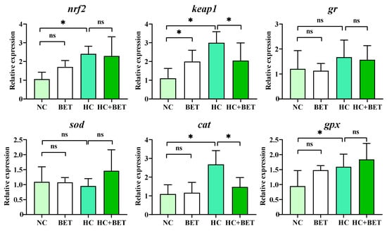 The expression of the genes involved in antioxidant systems in the livers of mandarin fish is shown in Figure 2. Compared with the NC group, the mRNA levels of nrf2, keap1, cat, and gpx in the HC group and keap1 in the BET group were significantly elevated (p < 0.05). In addition, the mRNA levels of keap1 and cat were significantly decreased in the HC + BET group compared with those in the HC group (p < 0.05). There were no significant differences in the mRNA levels of gr and sod between the groups (p > 0.05).