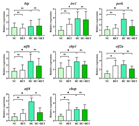 The expression of genes involved in ER stress in the livers of mandarin fish is shown in Figure 3. Compared with the NC group, the HC diet upregulated the transcript levels of ire1, perk, atf6, xbp1, eif2a, atf4, and chop. Meanwhile, the mRNA levels of eif2a and chop were significantly increased in the BET group compared with the NC group (p < 0.05). Furthermore, the expression levels of perk and atf4 were significantly down-regulated in the HC + BET group compared with those in the HC group (p < 0.05). No significant difference in the transcript level of bip was found between the groups (p > 0.05).