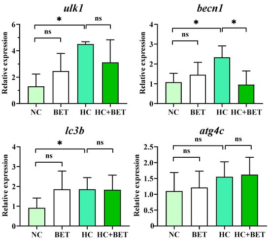 The expression of genes involved in autophagy in the livers of mandarin fish is shown in Figure 4. Compared with the NC group, the mRNA levels of ulk1, becn1, and lc3b were significantly increased in the HC group (p < 0.05). Meanwhile, the transcript level of becn1 was significantly decreased in the HC + BET group compared with that in the HC group (p < 0.05). The mRNA levels of atg4c were unchanged in all the groups (p > 0.05).