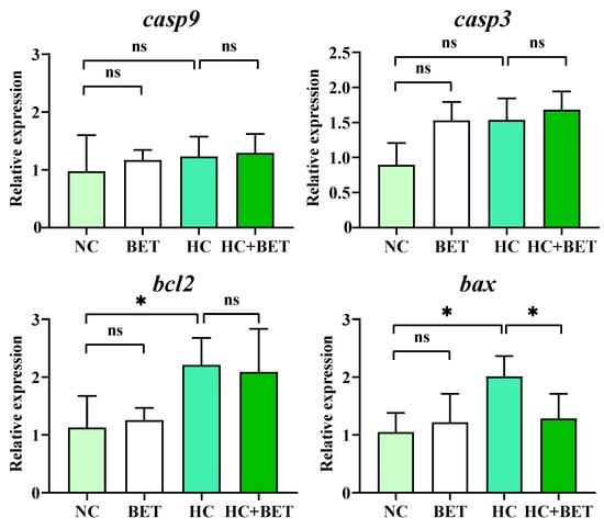 The expression of genes involved in apoptosis in the livers of mandarin fish is shown in Figure 5. Compared with the NC group, the mRNA levels of bcl2 and bax were significantly increased in the HC group (p < 0.05). The transcript level of bax was significantly lower in the HC + BET group than in the HC group (p < 0.05). No significant differences were observed in the mRNA levels of casp9 and casp3 between all groups (p > 0.05).