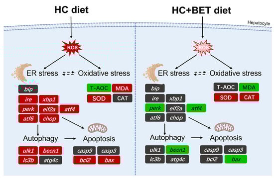 Schematic overview of the effects of dietary betaine on the HC-diet-induced oxidative stress, ER stress, and associated autophagy and apoptosis in the livers of mandarin fish. Red and green boxes represent up- and down-regulated genes/enzymes, respectively. The gray box indicates that no significant changes occurred.