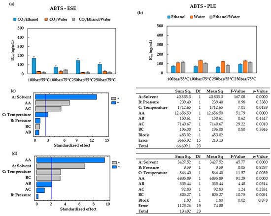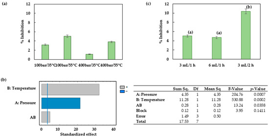 All the analytical determinations were performed in triplicate, and mean and standard deviations were calculated. Multilevel factorial designs were used to determine the effect of the variables on the extraction processes. The conditions for the factorial design were pressures of 100 and 250 bar; temperatures of 55 and 75 °C; and solvent composition expressed as ethanol concentrations of 0, 50 and 100%. On the basis of this design, a total of 12 experiments were carried out with two replicates for each condition and in a random way in order to minimize errors. The response variables were total extraction yield, total phenolic content and antioxidant activities using both DPPH and ABTS methods. The experimental data were processed by means of the software application STATGRAPHICS Plus 4.0 software (Warrenton, VA, USA) to carry out the analysis for the experimental design. A Pareto chart was used to represent the effect of the different factors, where the corresponding sign has been used to indicate a positive or negative effect attributable to each experimental variable.