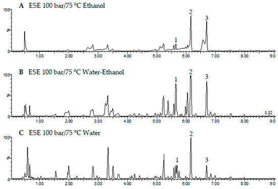 Figure 6 shows the base peak chromatograms of the three solvents studied. Three flavonoids were identified: Quercetin 3-O-xylosyl-rutinoside, Kaempferol 3-(2G-apiosylrobinobioside) and Kaempferol 4′-glucoside 7-rhamnoside, which were found at different concentrations depending on the solvent used for the extraction. Thus, the extracts produced using the CO