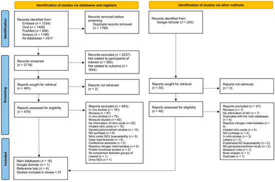 A total of 4517 records were initially identified from the following databases: Embase (n = 1234), Ovid (n = 1429), PubMed (n = 658), and Scopus (n = 1196). Duplicate records (n = 1799) were removed, leaving 2718 records for screening. Records (n = 2237) were excluded for the following reasons: 593 records were not related to the participants of interest, and 1644 records were not related to the outcome. Of the remaining 481 reports, 2 could not be retrieved. The remaining 479 reports were assessed for eligibility. Studies were excluded (n = 463) for the following reasons: 181 were in vivo studies, 87 were reviews, 75 were in vitro studies, 40 were mosquito studies, and the rest were excluded for other reasons such as no information on NO (n = 22), inhaled NO (n = 10), and genetic/polymorphism studies (n = 10). Finally, 21 studies were included in the review [16,23,29,30,31,32,33,34,35,36,37,38,39,40,41,42,43,44,45,46,47]. These studies were sourced from the main databases (n = 16), Google Scholar (n = 1), and reference lists (n = 4) (Figure 1).