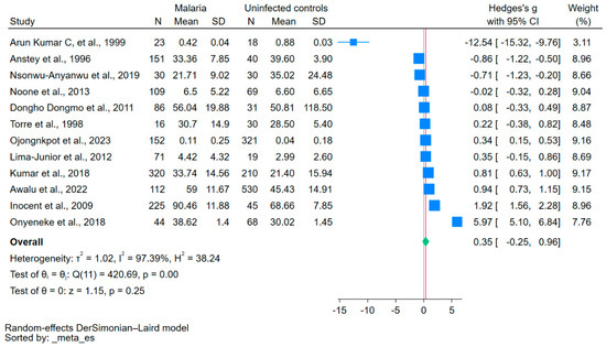 The NO levels in patients with malaria and uninfected controls were compared using a meta-analysis of 12 studies that reported NO levels as means or medians with standard deviations or ranges [16,30,31,35,37,39,40,42,43,44,46,47]. The mean NO levels were similar between the two groups (p = 0.25, Hedge’s g: 0.35, 95% CI: −0.25–0.96, I2: 97.39%, Figure 2).