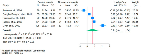Forest plot of meta-analysis comparing NO levels between patients with severe and nonsevere malaria. Mean NO levels were similar between the two groups (p = 0.09). The blue boxes indicate the effect estimates for individual studies, and the green diamond indicates the pooled effect estimate. N, number of participants in each group; SD, standard deviation; CI, confidence interval. References [16,35,36,37,38].