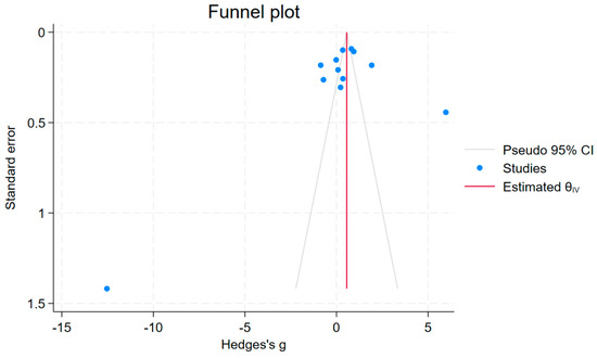 The funnel plot displays an asymmetrical distribution of effect estimates (blue dots) across the middle line (red vertical line).