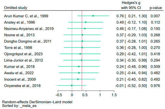 The leave-one-out analysis demonstrated significant influence from an individual study on the meta-analysis comparing patients with malaria to uninfected controls. The green dots indicate the pooled effect estimates for each rerun analysis. The red vertical line indicates the estimated overall results. The gray vertical line is the no-effect line. CI, confidence interval. References [16,30,31,35,37,39,40,42,43,44,46,47].