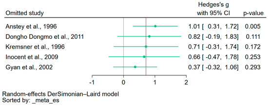 The leave-one-out analysis demonstrated significant influence from an individual study on the meta-analysis comparing patients with severe and non-severe malaria. The green dots indicate the pooled effect estimates for each rerun analysis. The red vertical line indicates the estimated overall results. The gray vertical line is the no-effect line. CI, confidence interval. References [16,35,36,37,38].