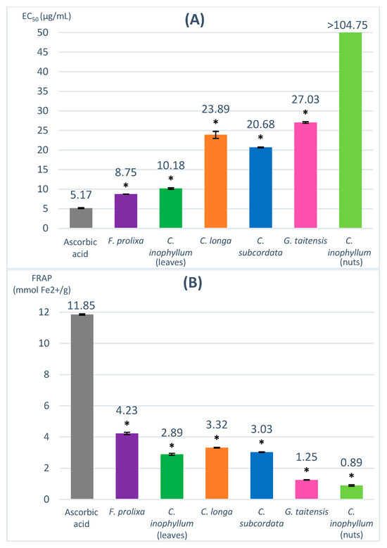 C. inophyllum nuts extract showed the lowest FRAP value (0.89 mmol Fe2+/g) and seemed to have very low antioxidant properties. The FRAP value of C. inophyllum leaves extract was higher (2.89 mmol Fe2+/g) than the obtained result for C. inophyllum nuts extract. Similar differences in antioxidant activity between leaves and nuts was reported by Hughes et al. for ethyl acetate and aqueous extract [18]. C. subcordata extract had a FRAP value of 3.03 mmol Fe2+/g. Only very few data are reported about the properties of this plant, but a previous study mentioned some antioxidant activity of ethanol leaves extracts in rat models [28]. F. prolixa extract showed the highest FRAP value (4.23 mmol Fe2+/g), indicating the best antioxidant capacity among the studied plant extracts.