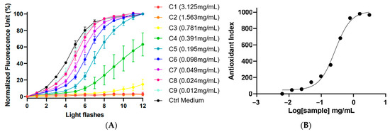 AOP1 assay of F. prolixa crude extract. (A) kinetic data: normalized fluorescence unit (%) obtained with increasing light flashes at each tested concentrations; (B) Dose–Response graph (EC50 = 268.0 µg/mL).