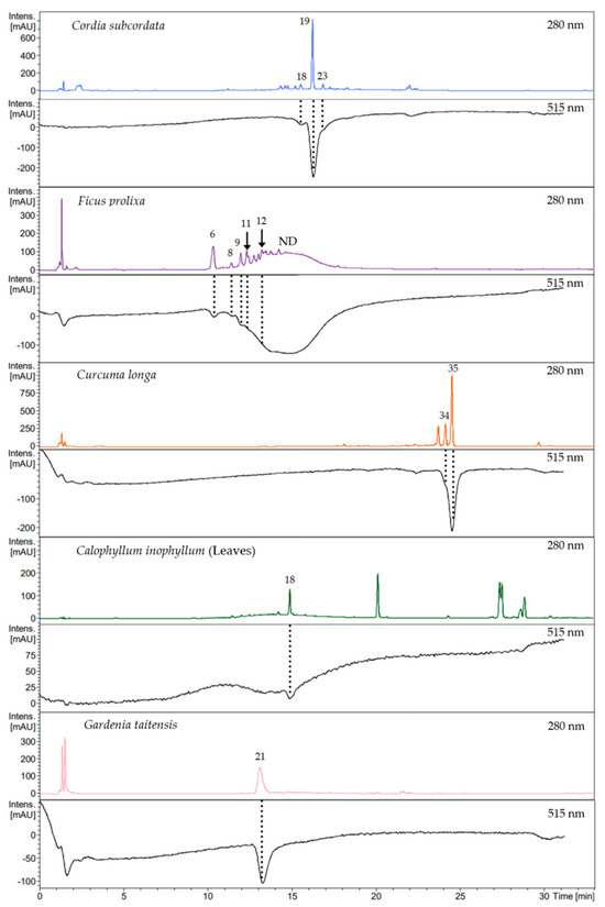 Chromatograms of Online RP HPLC DPPH assay. Crude extract profiles were recorded at 280 nm and their corresponding active compounds, shown in negative peaks, were recorded at 515 nm: chlorogenic acid (6), procyanidin type B (8), epicatechin (9), 5-O-caffeoylshikimic acid (11), procyanidin type C (12), quercetin-O-rhamnoside (18), rosmarinic acid (19), 3,5-di-O-caffeoyl-4-O-(3-hydroxy, 3-methyl)glutaroylquinic acid (21), lithospermate B (23), demethoxycurcumin enol form (34), curcumin enol form (35), ND: Not Determined.