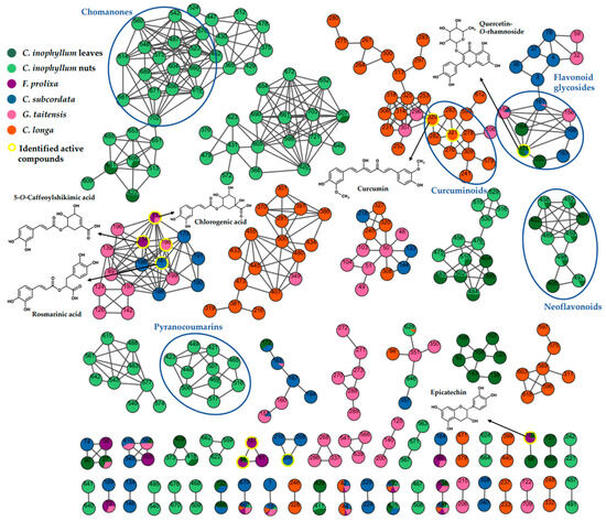 As few data are available regarding F. prolixa and C. subcordata extract constituents, this molecular network facilitated the identification process. Identification of compounds from well-known plants with phytochemistry LC-MS data helped to confirm the chemical class of compounds in the cluster from plants of unknown composition. Moreover, some metabolites found in various plants, and that have been identified in one of them in previous studies, helped to confirm their identification and occurrence in the other less known plants.