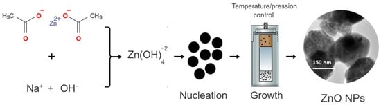 ZnO NPs synthesis began with the formation of zinc hydroxide species, in a condition of a basic environment—herein, in the presence of NaOH. Thereafter, the zinc hydroxide species led to the formation of crystalline nuclei, starting the crystal growth process [30]. The disturbance of the system, with increased pressure and temperature added to the hydrothermal reaction resulted in the recrystallization of ZnO, directly influencing the growth of anisotropic crystals and crystallization in hexagonal ZnO NPs [31]. Figure 1 shows a schematic representation of this synthesis.