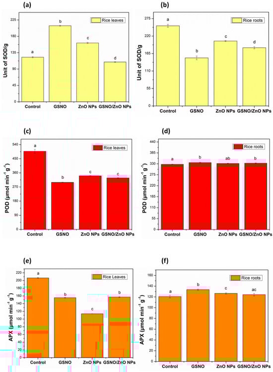 Comparing the roots data, as shown in Figure 3f, the activity of the APX enzyme showed a slight increase when the rice plants were treated with ZnO NPs and GSNO separately, compared to the control group, indicating that these treatments did not induce an increase in H2O2. Corroborating this hypothesis, the POD determination also showed a very small significant increase. However, SOD enzyme activity decreased significantly when the plants were treated with GSNO, ZnO NPs, and GSNO–ZnO NPs, compared to the control group (Figure 3b). This reduction in SOD activity could be related to the moderate need for this enzyme to balance O2•− in the roots, which maintain the concentration of H2O2 near to the control level in plants [67,68]. SODs control the levels of these other species by regulating the concentration of O2•−. The dismutase activity of SODs speeds up the reaction of superoxide anions (O2•−) with each other, resulting in the chemical formation of oxygen and hydrogen peroxide (2O2•− + 2H+ → H2O2 + O2) [69]. As expected for a foliar application, the treatments did not produce a representative change in the enzymatic activity in roots, while in leaves the treatments’ effects were evident.