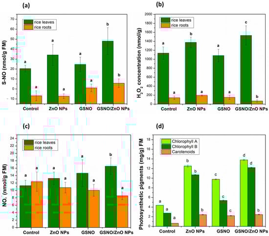 Significant changes were observed in the concentrations of S-NO, H2O2, and NO2− after foliar application of all treatments (Figure 4a–c). The concentration of S-NO showed a significant increase of 135% in the leaves of plants exposed to GSNO–ZnO NPs, compared to the control, and in the other treatments there was no significant increase in S-nitrosothiols (Figure 4a). In the roots, the same pattern was observed, which meant that the concentrations of S-NO showed a significant increase after the foliar application of the GSNO–ZnO NPs treatment.