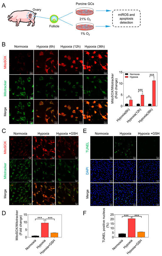 (1) Impact of hypoxia treatment on GCs’ mitochondrial ROS production: Porcine GCs were cultured at 37 °C in an environment containing 1% O2 (Hypoxia) or 21% O2 (Normoxia) using the previously established method [1,19]. mtROS levels were measured at 6–36 h after treatment.