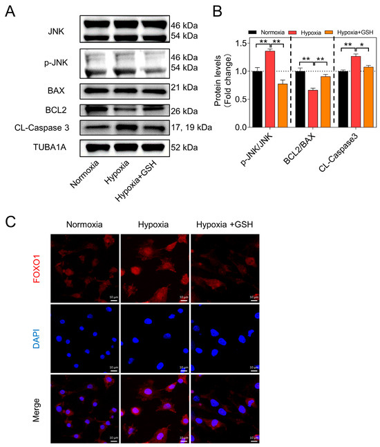 Previous studies have demonstrated that the core mechanism of GC apoptosis induced by oxidative stress involves the activation of the JNK-FOXO1 pathway [19]. To investigate this, we conducted Western blotting to detect the levels of JNK and apoptosis-related proteins. The results indicated that GSH treatment led to a reduction in the levels of apoptosis-related proteins, such as Cleaved-Caspase3, and a significant increase in the BCL2/BAX ratio (Figure 2A,B). Furthermore, the translocation of FOXO1 into the nucleus was notably inhibited (Figure 2C).