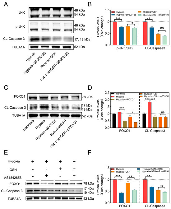 (2) Elucidation of whether mtROS induces GC apoptosis via activation of the JNK-FOXO1 pathway: We assessed whether the JNK-FOXO1 pathway was activated by adding the ROS scavenger (GSH, 2 mM). Additionally, cells were pre-treated with a JNK inhibitor (SP600125, 10 μM) or FOXO1 inhibitor (AS1842856, 10 μM) for 2 h, or FOXO1 was knocked down by siRNA for 24 h, followed by GSH treatment to determine JNK-FOXO1 activation. The specific experimental groups included: Normoxia, Hypoxia, Hypoxia + GSH, Hypoxia + SP600125, Hypoxia + GSH + SP600125, Hypoxia + siFOXO1, Hypoxia + GSH + siFOXO1, Hypoxia + AS1842856, and Hypoxia + GSH + AS1842856.