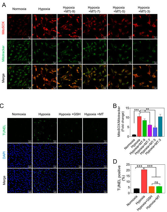 (3) Impact of melatonin treatment on mitochondrial ROS production in hypoxic GCs: GCs were cultured under hypoxic conditions and treated with varying concentrations (10−9 to 10−3 M) of exogenous melatonin for 36 h. Following that, we evaluated mtROS levels and determined that a concentration of 10−5 M melatonin would be used for subsequent experiments. To investigate changes in apoptosis levels, a combination of GSH and melatonin was added for 24 h.