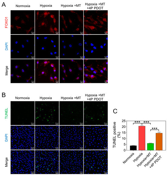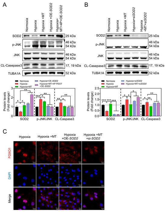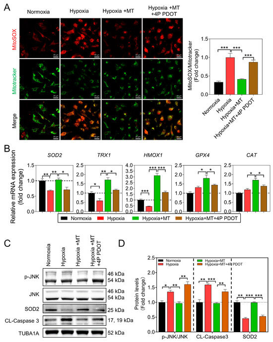 (4) Exploration of upstream pathways of melatonin in mitigating mtROS: To investigate whether melatonin affects mtROS generation via the MTNR1B receptor, we employed 4P PDOT (100 nM), a potent and selective MTNR1B antagonist. Cells were divided into four groups: Normoxia, Hypoxia, Hypoxia + MT, and Hypoxia + MT + 4P. The impact on mtROS, antioxidant gene expression, and the JNK-FOXO1-apoptosis pathway was evaluated. Furthermore, SOD2, a specific mitochondrial ROS scavenger, was employed to investigate whether melatonin clears mtROS via the MTNR1B-SOD2 pathway. Cells were divided into several groups: Hypoxia, Hypoxia + MT, Hypoxia + OE-SOD2, and Hypoxia + MT + si-SOD2, and mtROS levels and regulation of the JNK-FOXO1 pathway proteins were assessed.