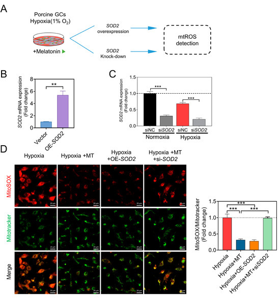 After overexpressing or knocking down SOD2 in GCs, we observed a substantial elevation in mRNA levels in the OE-SOD2 group (Figure 7A,B). Conversely, SOD2 knockdown led to a notable reduction in SOD2 expression levels, both in normoxic and hypoxic conditions (Figure 7C). However, when SOD2 was knocked down after melatonin treatment, the clearance of mtROS by melatonin was reversed (Figure 7D).