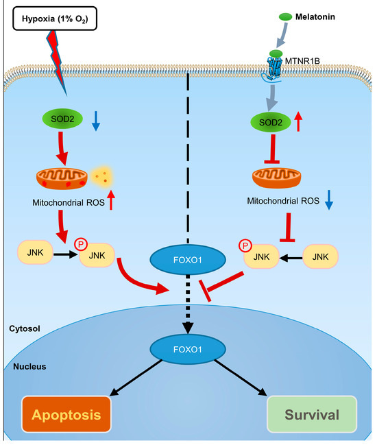 The current study offers a comprehensive insight into the protective mechanism of melatonin against hypoxic stress in porcine GCs. We meticulously identified mtROS as a primary source of oxidative damage in GCs exposed to hypoxia. Furthermore, we elucidated the fundamental mechanism by which mtROS triggers apoptosis in GCs through the activation of the JNK-FOXO1 pathway. Notably, our findings unveil that melatonin plays a pivotal role in orchestrating the clearance of mtROS. This regulatory effect is achieved through the modulation of the expression of the mitochondrial-specific antioxidant enzyme, SOD2. Consequently, the regulatory mechanism effectively suppresses the mtROS-JNK-FOXO1 pathway, ultimately leading to a significant attenuation of apoptosis in GCs subjected to hypoxic stress (refer to Figure 9).