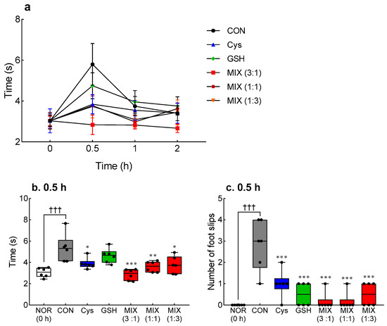 To select the appropriate mixing ratio of Cys and GSH, changes in alcoholic behavior followed by individual and mixed treatments of Cys and GSH were confirmed using the BBT (Figure 1). The BBT was performed at 0.5, 1, and 2 h after alcohol administration, and differences between the experimental groups were observed at 0.5 h (Figure 1a). After alcohol administration (0.5 h), the total reach time (p < 0.001, Figure 1b) and the number of foot slips (p < 0.001, Figure 1c) were significantly increased in the control group (CON) compared with those before alcohol administration. The Cys-treated group (3.8 s, p < 0.05) had a significantly reduced arrival time compared to the CON group (5.8 s), and the GSH-treated group (4.7 s) displayed a decreasing tendency (Figure 1b). The MIX-treated groups had significantly shorter reach times than the CON group at all ratios tested (3:1, p < 0.001; 1:1, p < 0.01; and 1:3, p < 0.01). In particular, MIX treatment (3:1) showed a shorter reach time (2.8 s) than individual chemical treatments (Cys and GSH). The number of foot slips which increased by alcohol administration was also significantly improved by individual and mixed treatment of Cys and GSH administration (p < 0.001, Figure 1b), with the MIX-treated (3:1) group showing the lowest value. Overall, alcohol-induced behaviors in the MIX-treated group were effectively improved at a 3:1 ratio; therefore, this ratio of Cys to GSH was deemed to be most appropriate and used in further experiments.
