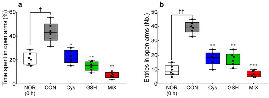 Effects of Cys, GSH, and MIX treatment on anxiety-related behavior analyzed with the elevated plus maze test in ethanol-treated ICR mice. After 0.5 h of ethanol treatment, (a) % time spent in the open arm and (b) number of entries. Cys, GSH, and MIX were orally pretreated 30 min before administration of ethanol (2 mL/kg). The elevated plus maze test was performed before ethanol intake (0 h) and 0.5 h after ethanol intake. NOR: untreated group (0 h), CON: ethanol-treated group, NOR: untreated group (0 h), CON: ethanol-treated group, Cys: 200 mg/kg Cys-treated group, GSH: 200 mg/kg GSH-treated group, MIX: 200 mg/kg MIX-treated group. Values represent mean ± SEM. Different symbols indicate statistically significant differences at the p < 0.05 level (ANOVA followed by Tukey’s test): † p < 0.05, †† p < 0.01 vs. NOR (0 h) group; * p < 0.05, ** p < 0.01, and *** p < 0.001 vs. CON group. Cys, cysteine; GSH, glutathione; MIX, the mixture of cysteine and glutathione in a 3:1 ratio.
