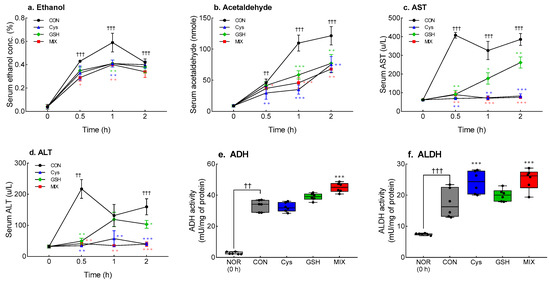 Figure 3c,d depict the changes in serum AST and ALT levels over time after ethanol administration. Serum AST (p < 0.01, Figure 3c) and ALT (p < 0.05, Figure 3d) levels in the CON group were significantly increased after ethanol administration (0.5 h) compared to 0 h. Administration of Cys, GSH, and MIX significantly suppressed the rapid increase in AST (p < 0.01) and ALT (p < 0.01) levels 0.5 h after ethanol administration. In particular, the MIX-treated group showed the lowest AST and ALT levels among all experimental groups; the levels being equivalent to those before alcohol administration.