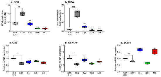 Effects of Cys, GSH, and MIX treatment on (a) ROS and (b) MDA contents, and (c–e) antioxidant-related mRNA expression in the liver of ethanol-treated ICR mice. Cys, GSH, and MIX were orally pretreated 30 min before administration of ethanol (2 mL/kg). After 2 h of ethanol administration, animals were sacrificed, and biochemical analysis of liver tissue was performed. NOR: untreated group (0 h), CON: ethanol-treated group, Cys: 200 mg/kg Cys-treated group, GSH: 200 mg/kg GSH-treated group, MIX: 200 mg/kg MIX-treated group. Values represent mean ± SEM. Different symbols indicate statistically significant differences at p < 0.05 (ANOVA followed by Tukey’s test): †† p < 0.01, ††† p < 0.001 vs. NOR group; *p < 0.05, ** p < 0.01, and *** p < 0.001 vs. CON group. Cys, cysteine; GSH, glutathione; MIX, the mixture of cysteine and glutathione in a 3:1 ratio; ROS, reactive oxygen species; MDA, malondialdehyde; CAT, catalase; GSH-Px, glutathione peroxidase; SOD-1, superoxide dismutase-1; ns, not significant.