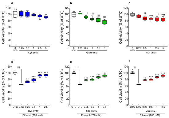Effect of Cys, GSH, and MIX treatment on cell viability in the absence (a–c) and presence (d–f) of ethanol in HepG2 cells. HepG2 cells were treated with Cys, GSH, and MIX in the presence or absence of ethanol for 24 h. UTC: untreated cells, ETC group: ethanol-treated cells. Values are mean ± SD. Different symbols indicate significant differences at the p < 0.05 level (ANOVA followed by Tukey’s test). †† p < 0.01, ††† p < 0.001 vs. UTC group; ** p < 0.01 and ***p < 0.001 vs. ETC group. ns, not significant. Cys, cysteine; GSH, glutathione; MIX, the mixture of cysteine and glutathione in a 3:1 ratio.